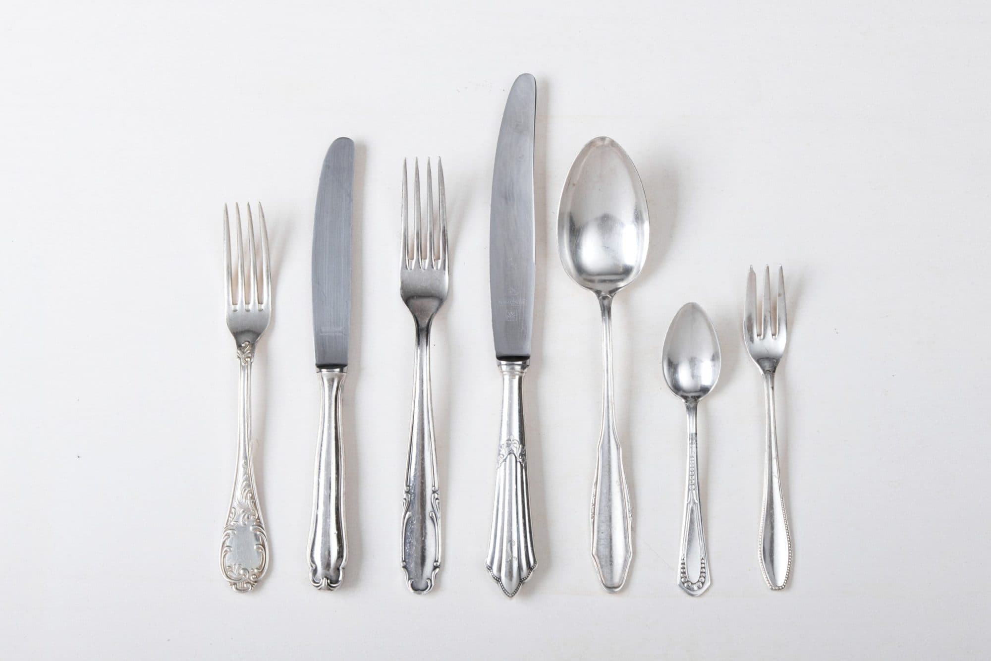The elegant vintage silver cutlery set Antonia for one person consists of a dinner knife, dinner fork, soup spoon, appetizer fork, appetizer knife, cake fork and teaspoon. This 7-piece, elegant cutlery set is a real eye-catcher.