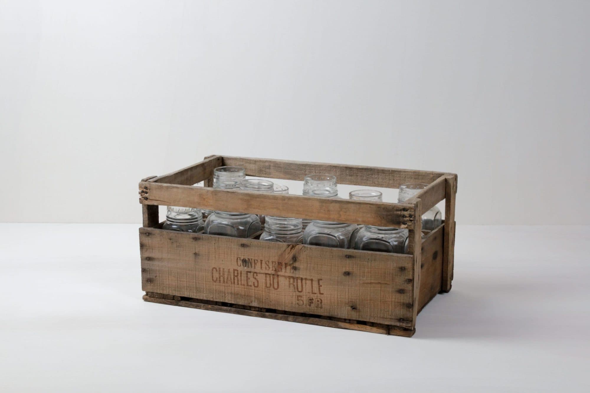 We rent this vintage jam crate Fermin together with ten original jars. The wooden box is a great decorative element and gives vintage events and trade fairs a rustic, charming look.