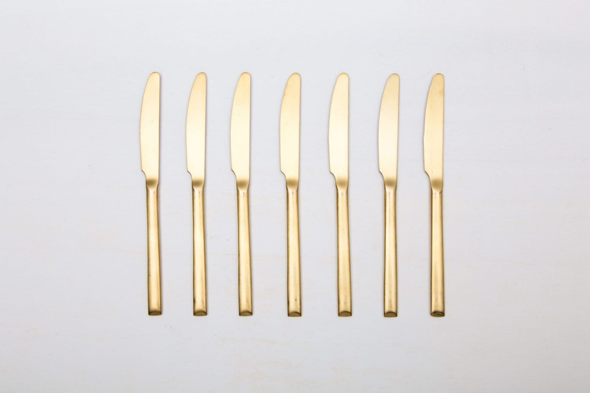 Matching the matt gold starter knive Ines, we also offer dinner forks, dinner knives, as well as table spoons, teaspoons and last but not least, cake shovels, serving spoons, butter shovels and vintage tableware for rent.