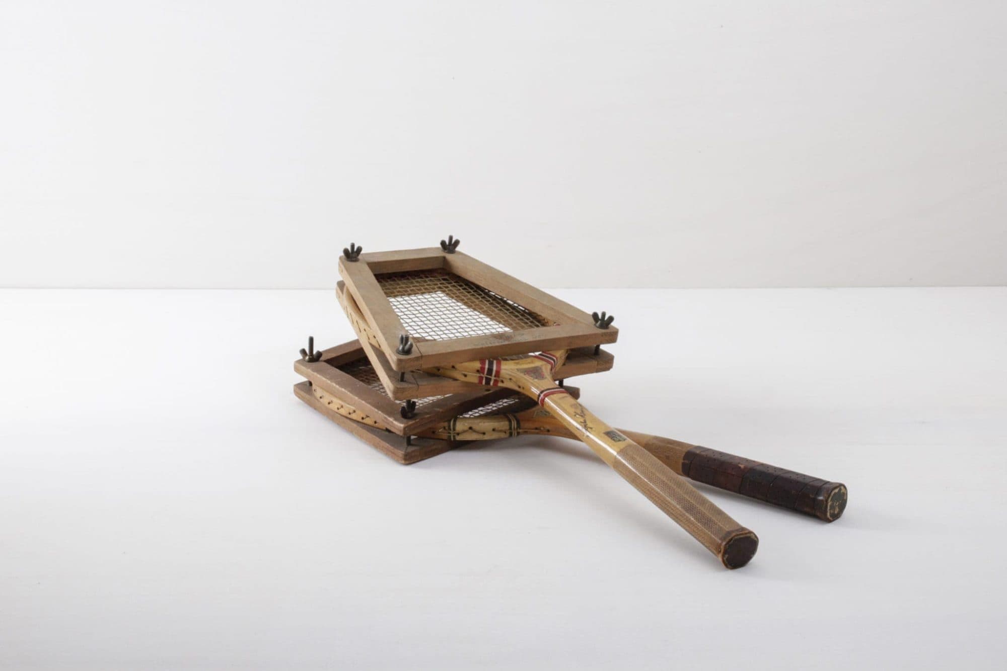 Two antique wooden tennis rackets from Hammer Bad Mergentheim. The original “Record” model including wooden stretcher is a nice decoration element for detail lovers and sports events.