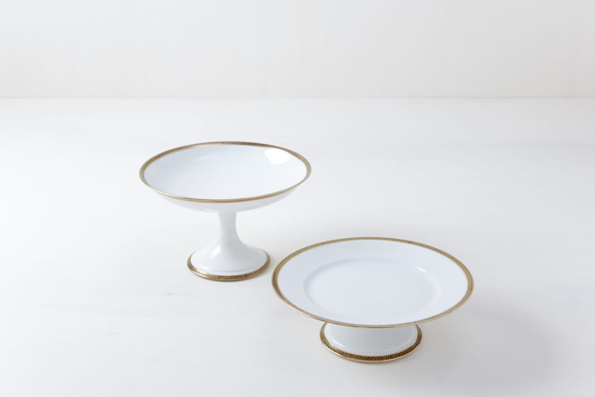 Das Kuchenplattenset Nora setzt sich aus zwei zueinander gehörenden Kuchenplatten zusammen. Miete das weiße Kuchenplattenset mit Goldrand solo oder in Kombination mit anderen Tortenständern, Etageren oder Kuchenplatten und gestalte ein hinreißendes Kuchenbuffett.