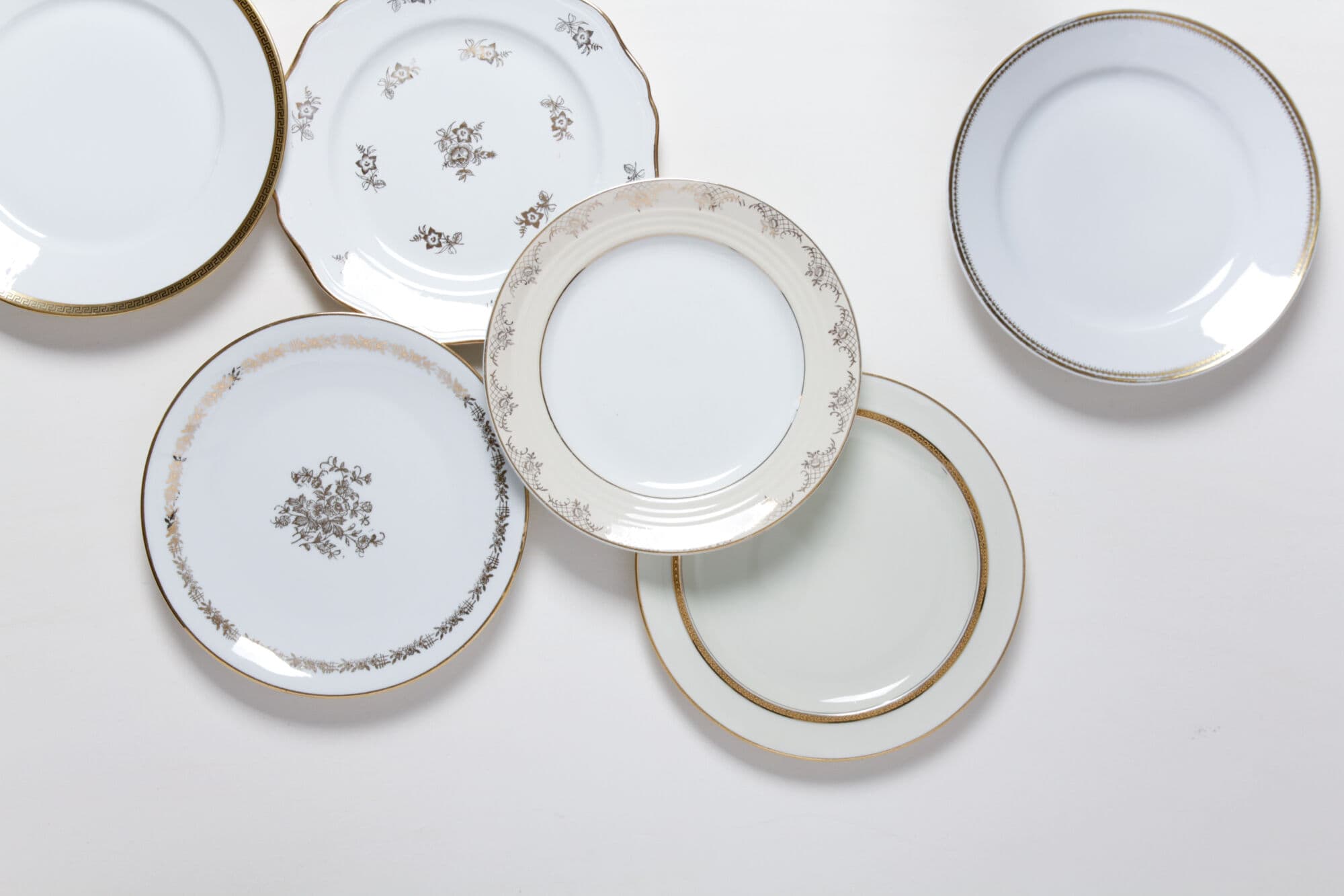 Margaritas Speiseteller sind aus weißem oder elfenbeinfarbenem Porzellan gefertig und haben eine wundervolle Goldverzierung.