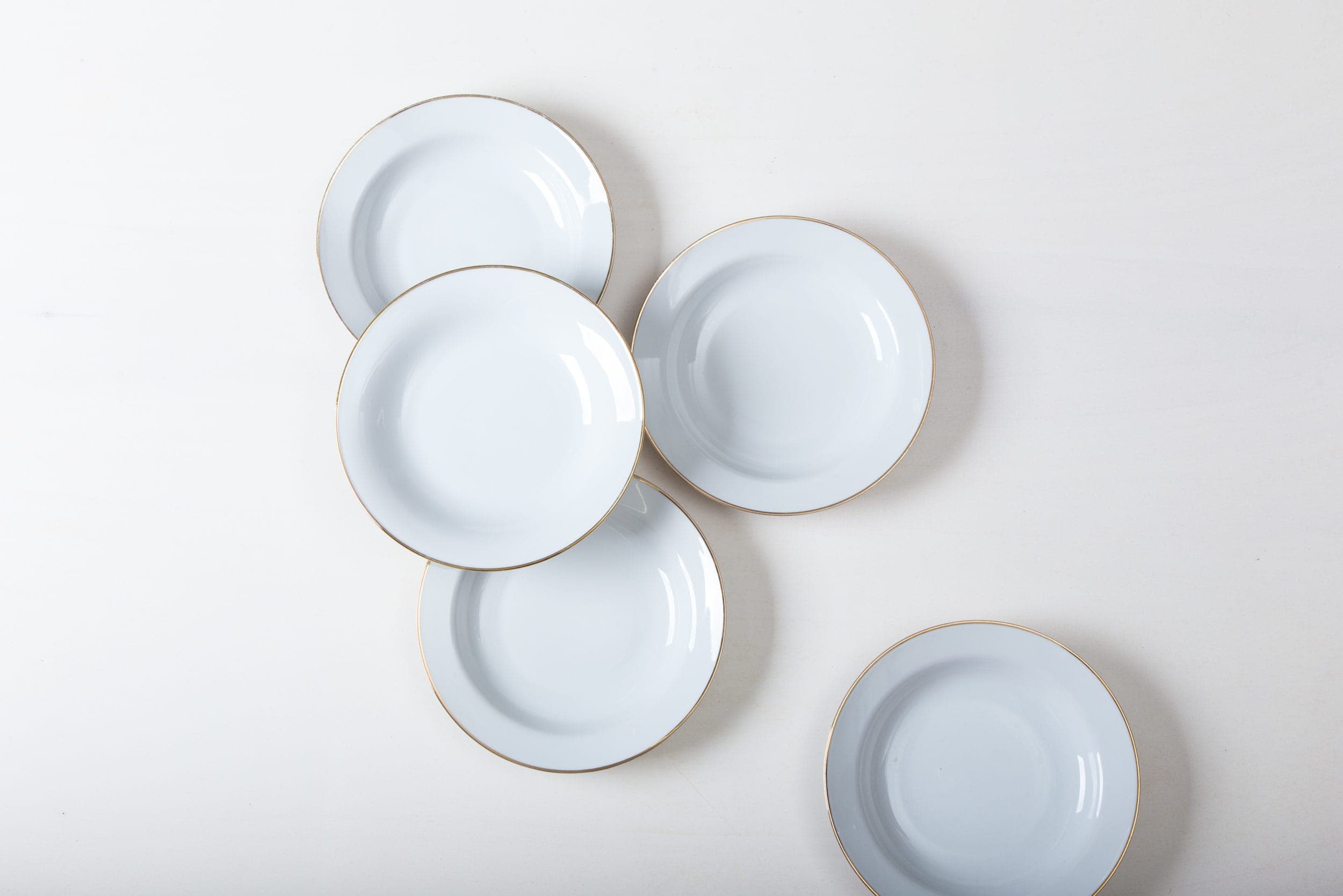 Elegante weiße mismatching Suppenteller mit schmalem Goldrand, kombiniert aus verschiedenen Serien aus den 1930er bis 1960er Jahren, sind sie fast nahezu identisch in Form und Farbe zusammengestellt.