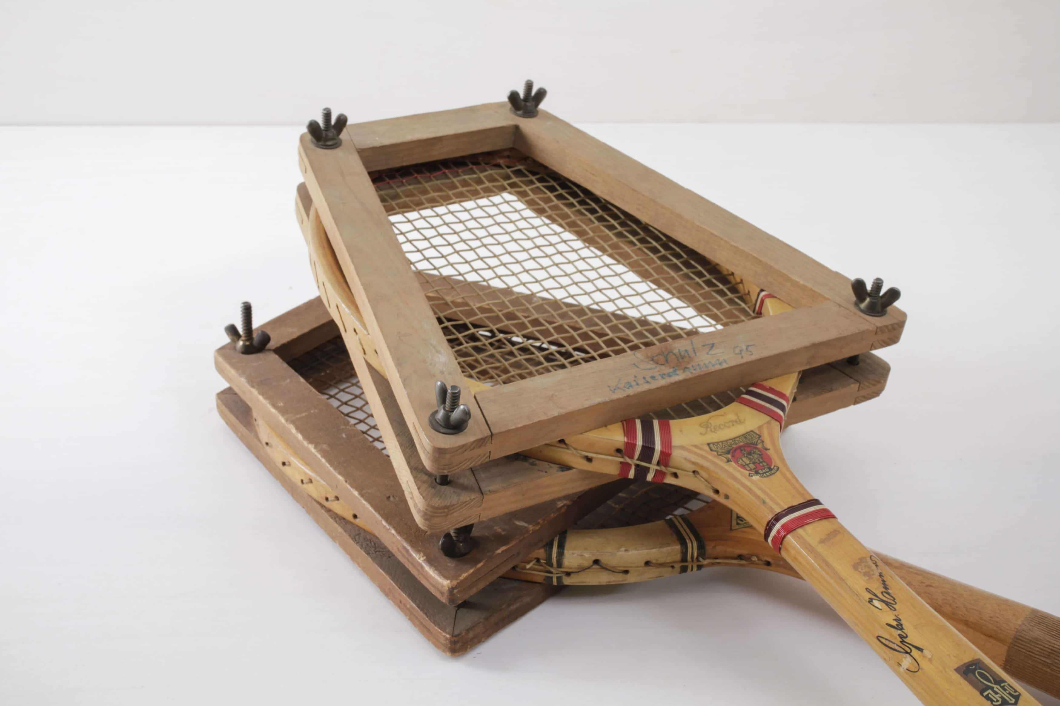 Zwei antike Holztennisschläger von Hammer Bad Mergentheim. Das originale „Record“ Modell inklusive Holzspanner ist ein schönes Dekorationselement für Detailverliebte und Sportevents.