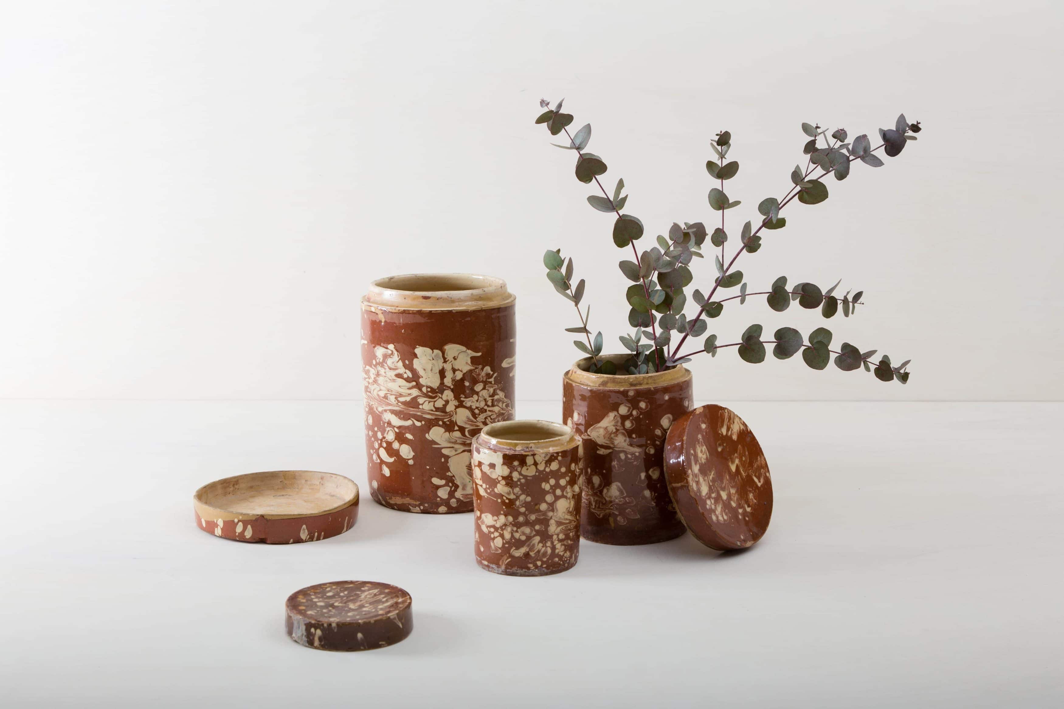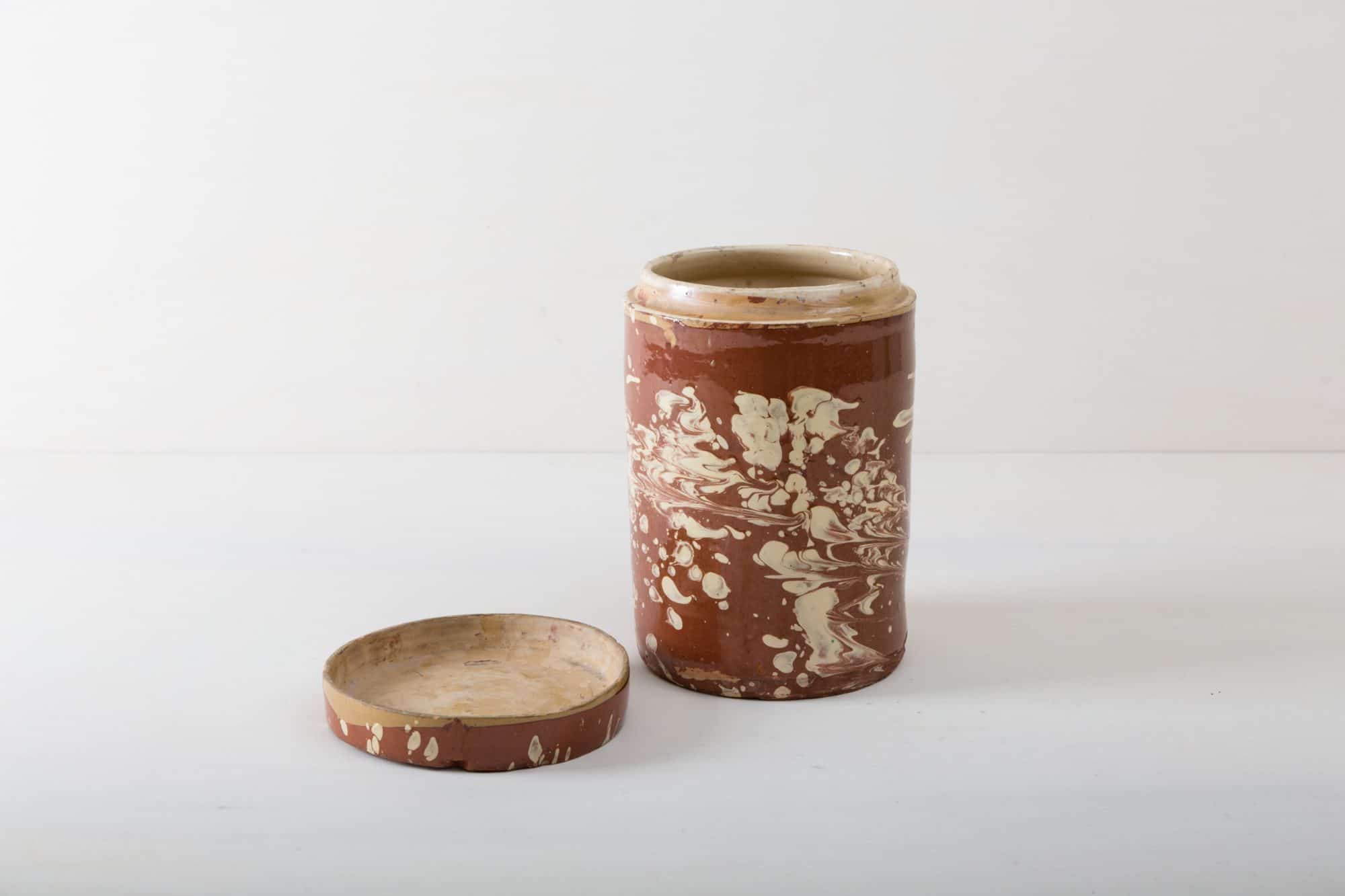 Braun marmorierte Keramik, die alte Technik der Marmorglasur ist in Süditalien sehr beliebt. Die zylindrischen Vorratsgefässe stammen aus den 1930er Jahren und es wurden darin Antipasti oder Oliven gelagert. Nun gut gereinigt kannst Du die Gefäße als Vase für Dein Eventstyling oder Hochzeitsdekoration einsetzen.