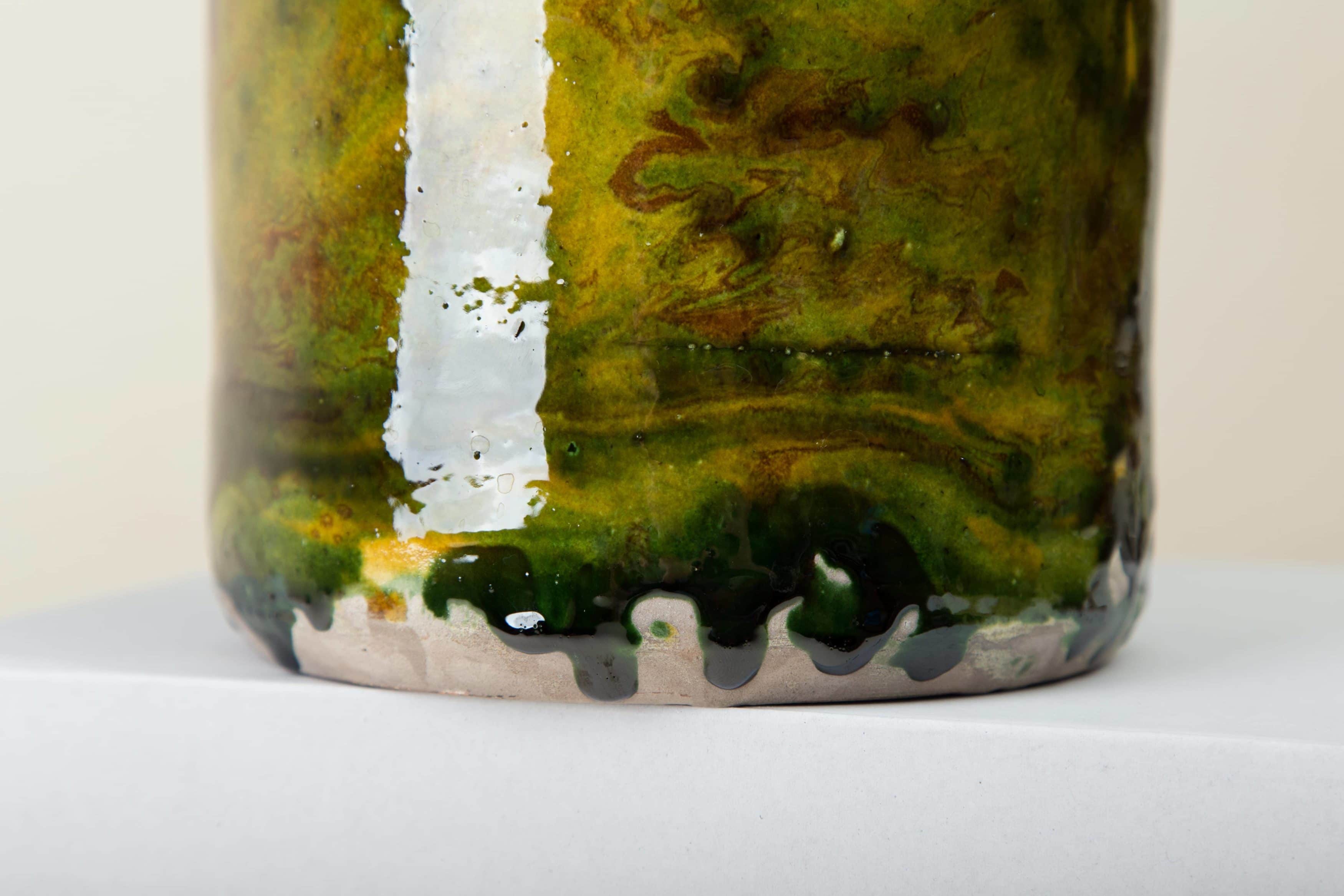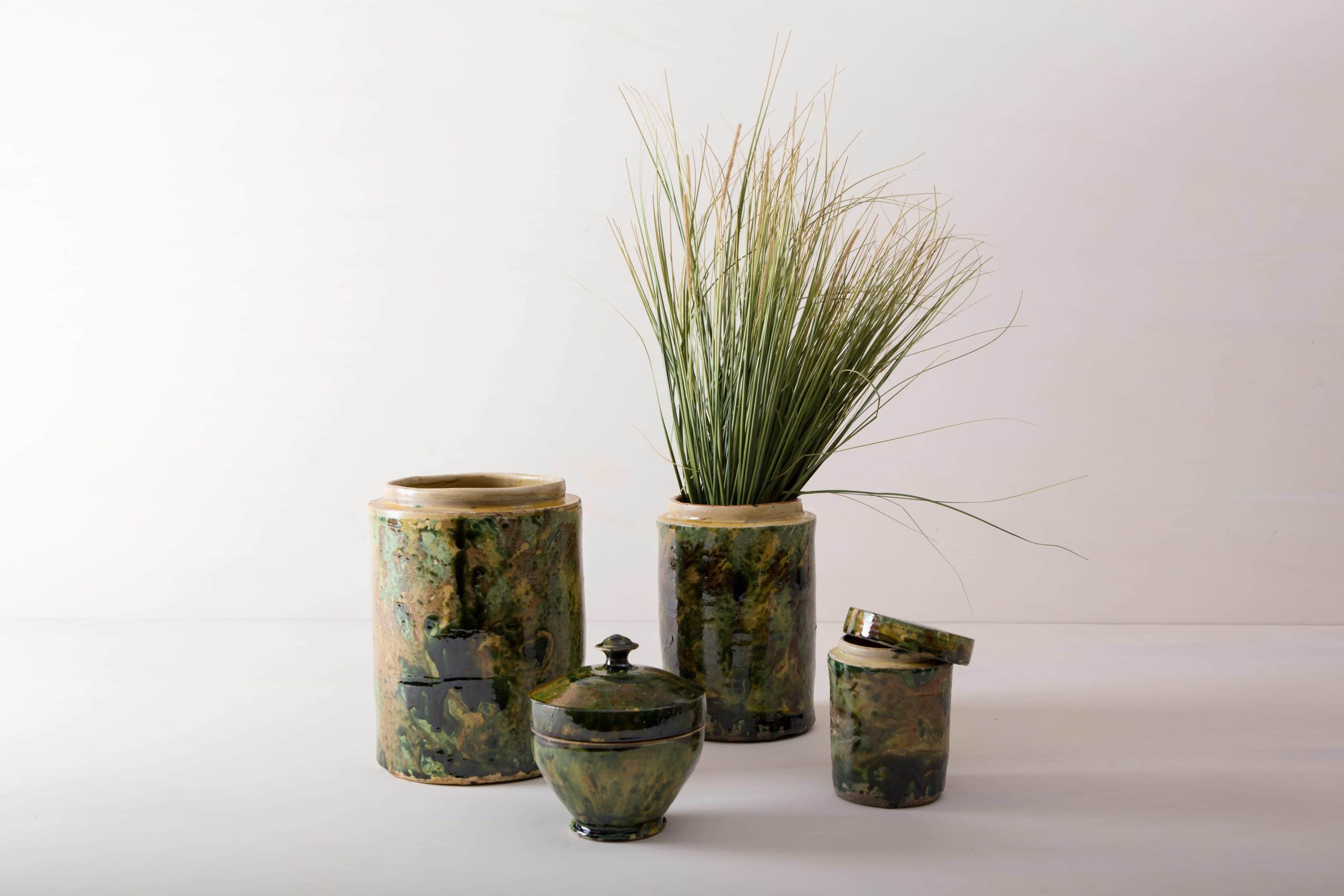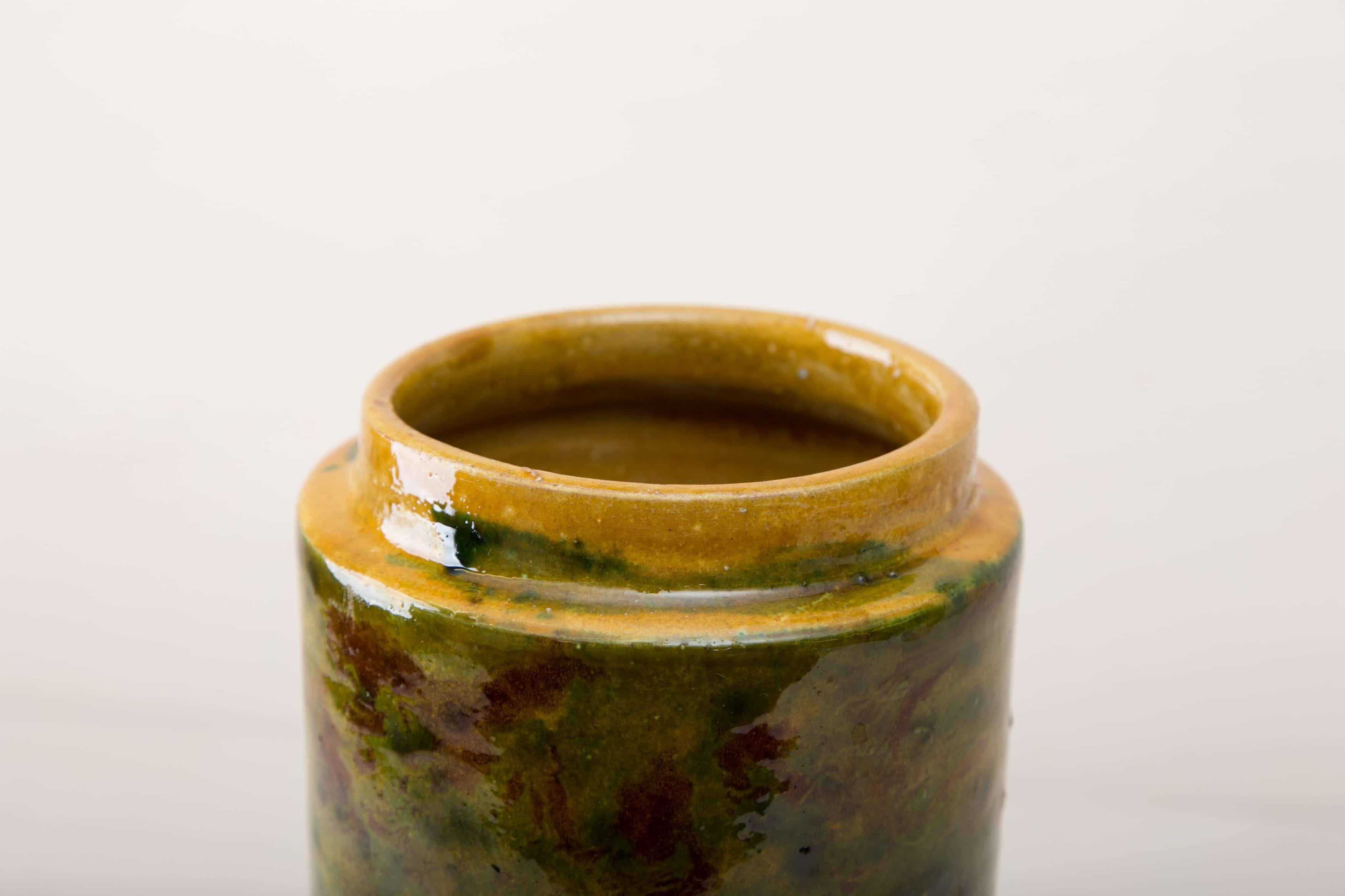 Grün marmorierte Keramik, die alte Technik der Marmorglasur ist in Süditalien sehr beliebt. Die zylindrischen Vorratsgefässe stammen aus den 1930er Jahren und es wurden darin Antipasti oder Oliven gelagert. Nun gut gereinigt kannst Du die Gefäße als Vase für Dein Eventstyling oder Hochzeitsdekoration einsetzen.