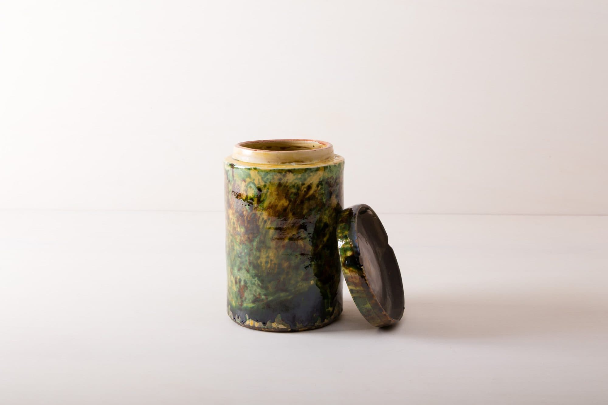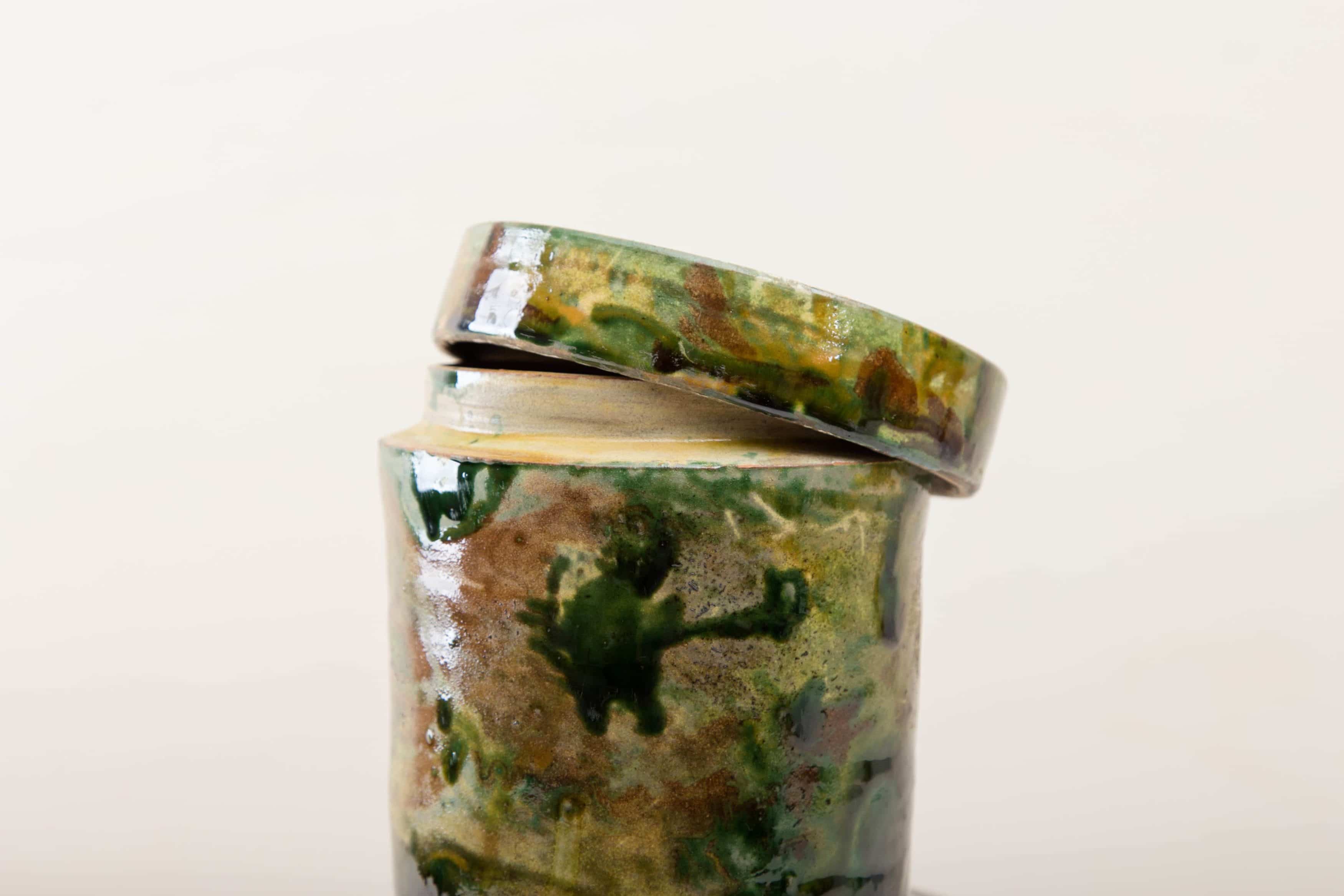 Grün marmorierte Keramik, die alte Technik der Marmorglasur ist in Süditalien sehr beliebt. Die zylindrischen Vorratsgefässe stammen aus den 1930er Jahren und es wurden darin Antipasti oder Oliven gelagert. Nun gut gereinigt kannst Du die Gefäße als Vase für Dein Eventstyling oder Hochzeitsdekoration einsetzen.