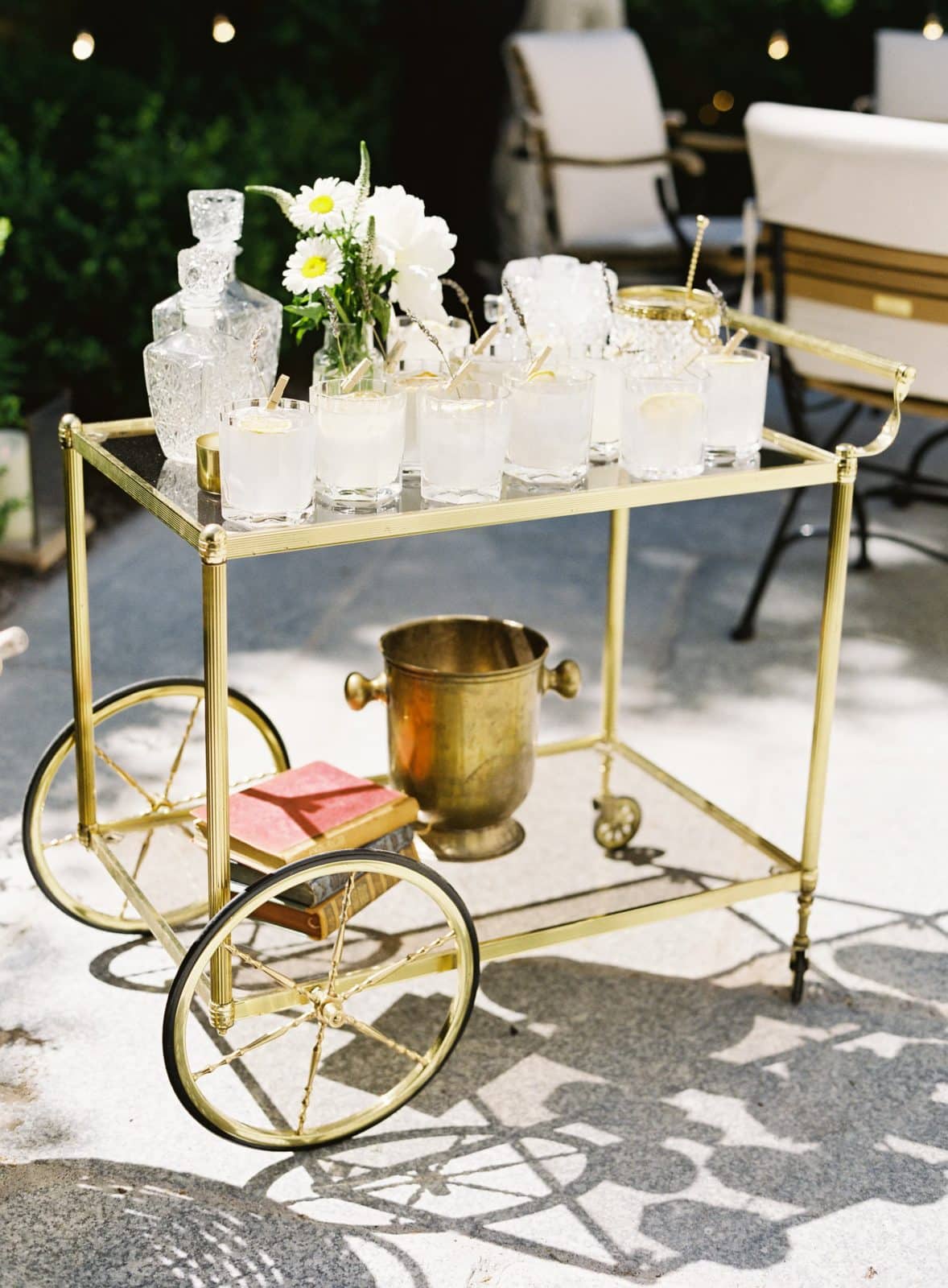 Die goldfarbenen Deko Details verliehen dem Setting eine elegante Note. Unsere schmalen goldenen Messingvasen „Elisa“, die wir mit wunderschönen sommerlichen Blumen dekorierten, kamen auf der hellen Tafel besonders gut zur Geltung. Das goldene Besteck „Ines“, unsere Teelichthalter „Elisa“ und unser elfenbeinfarbenes Kuchengedeck „Magdalena“ mit Goldrand machten das Festessen zu einer fast schon himmlischen Erfahrung. Sogar die erfrischenden Getränke und pompösen Blumen leuchteten strahlend weiß auf unserem goldenen Servierwagen „Agatha“ und verbreiteten eine elegante Sommerstimmung.