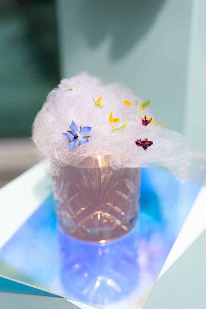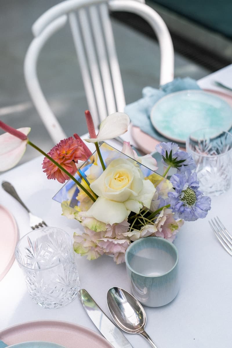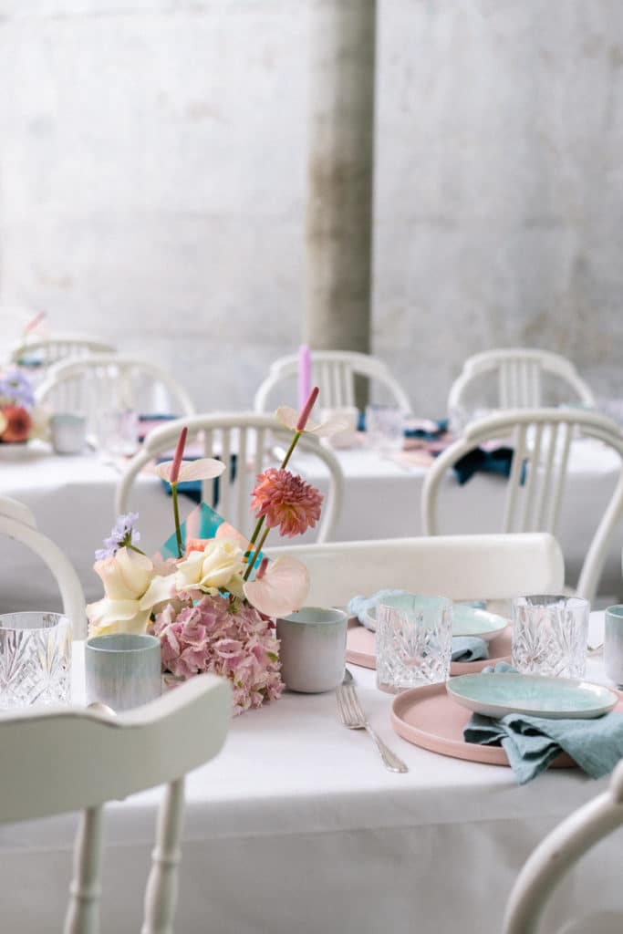 Bestuhlt wurde die helle Tafel mit unseren weißen Thonet Stühlen „Susana“, die den Vintage Flair besonders gut zur Geltung brachten. Unser versilbertes Besteck „Antonia“ sowie unsere Sekt,- Wein,- und Wassergläser „Victoria“ bildeten einen wunderbaren Kontrast zu den Pastelltönen des Geschirrs und der Blumenarrangements. Auf den großen Tischdecken, die wie eine Art weiße Leinwand wirkten, kamen die liebevoll ausgesuchten Blumenkombinationen besonders gut zum Vorschein. Abgerundet wurde die Tischdekoration von den von der Decke hängenden holografischen Fragmenten, die der Location ein zusätzlich glamouröses Ambiente verliehen.
