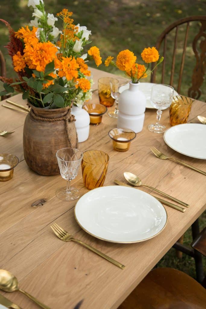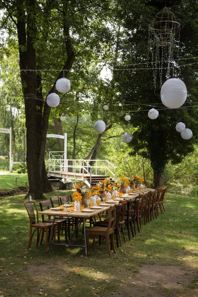 Die massive Holztafel war der optische Mittelpunkt der Gartenparty und kreierte eine rustikale Stimmung. Unsere elfenbeinfarbenen Teller „Magdalena“ mit zartem Goldrand sowie unsere mattgoldenen Bestecksets „Ines“ bildeten eine perfekte Ergänzung zum harten Holzlook – ein inspirierender Stilmix, der auch die Gäste vor Ort überzeugt hat! Mithilfe von unseren bernsteinfarbenen Wassergläsern „Ana“ und passenden orangefarbenen Blumen erzeugten wir eine leichte sommerliche Note, die sich optimal in das Gesamtbild einfügte. Die edlen Akzente der Gold- und Orangetöne bildeten zu unseren ländlich antiken Holzvasen „Blanco“ und unseren mismatching Holzstühlen „Carlos“ einen einzigartigen Gegensatz.