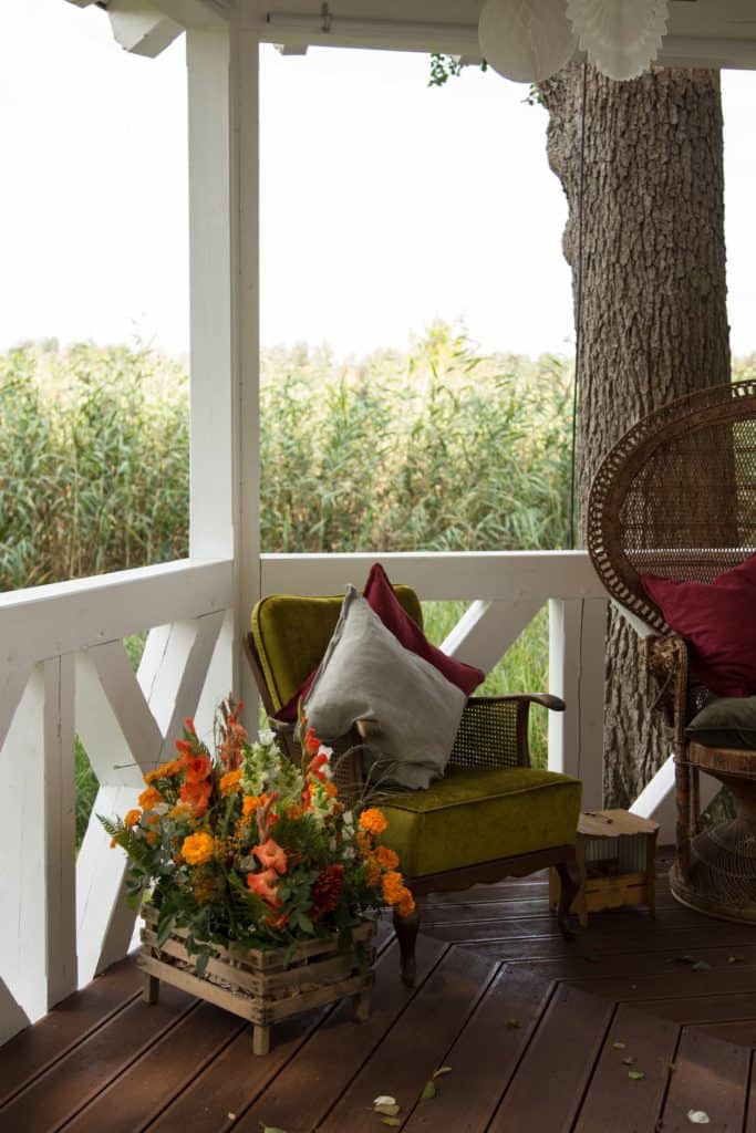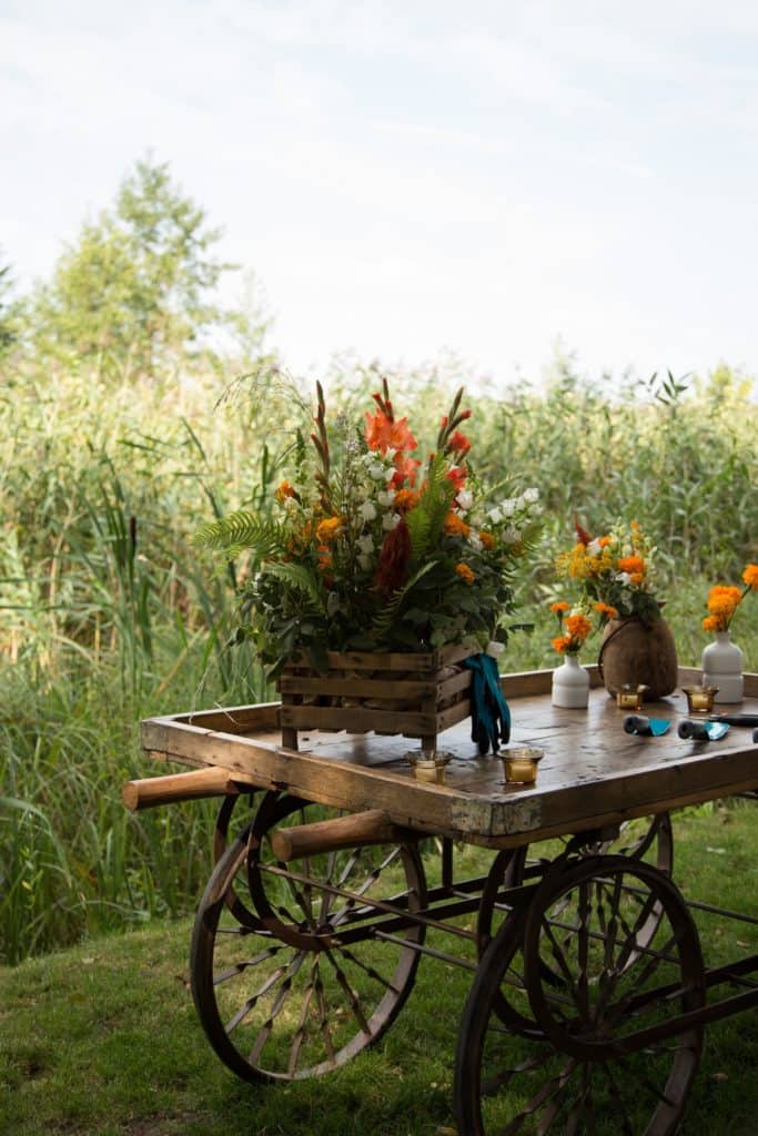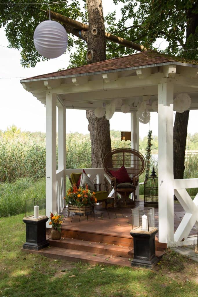 Die Brand Colors zogen sich dank der orangefarbenen Elemente der Tischdekoration wie ein roter Faden auch durch andere Bereiche der Veranstaltung. Ein wesentlicher Blickfang war unser Handwagen „Anselmo“, den wir mit verschieden Vasen, Kerzen und unserer mit Farn und Blumen gefüllten Apfelkiste „David“ dekorierten. Die mit echten – natürlich auch orangefarbenen – Blumen verzierte Schaukel und unser Vogelkäfig „Anthea“ luden die Gäste ein, ein paar verträumte Erinnerungsfotos zu machen. Unter dem weißen Pavillon wurde unser Pfauenstuhl „Flavio“ zum Highlight.