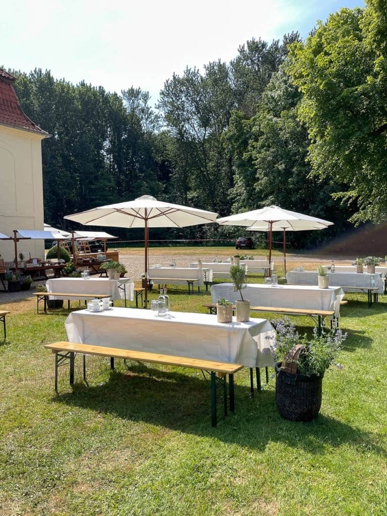 Ein lockerer Brunch im Freien am dritten und letzten Tag läutete den Ausklang dieses imposanten und doch ungezwungenen Geburtstagsevents ein. Für dieses Setting liehen wir uns historische Markstände in der Region aus, die wir aus unserem Repertoire so nicht stellen konnten und es bereitete uns großes Vergnügen passende Mietmöbel zu organisieren, die sich mit der Kundenvorstellung treffen. Wieder konnten wir mit einer nahegelegenen Leihgabe eine nachhaltige und authentische Lösung finden. Nachhaltige Events zu gestalten ist uns ein wichtiges Anliegen und gerade deshalb achteten wir bei unserem Eventdesign auf eine umweltschonende Planung mit lokalen Alternativen